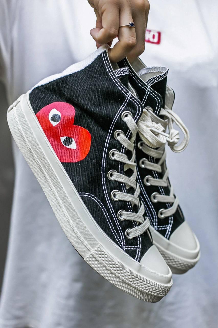 Розкішна колаборація в наявності! Чоловічі кеди Конверс х Ком Де Гарсон Плей Чак високі в чорному кольорі з червоним серцем вже в наявності. Якісні чоловічі кеди, виконані з преміальних матеріалів.